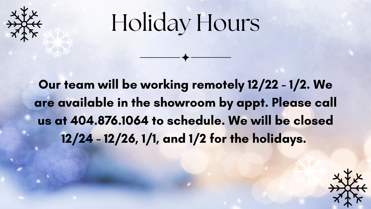 Wishing you a bright holiday season and a happy New Year. Our team will be working remotely 12/22 – 1/2. We are available in the showroom by appt. Please call us at 404.876.1064 to schedule. We will be closed 12/24-12/26, 1/1, and 1/2 for the holidays